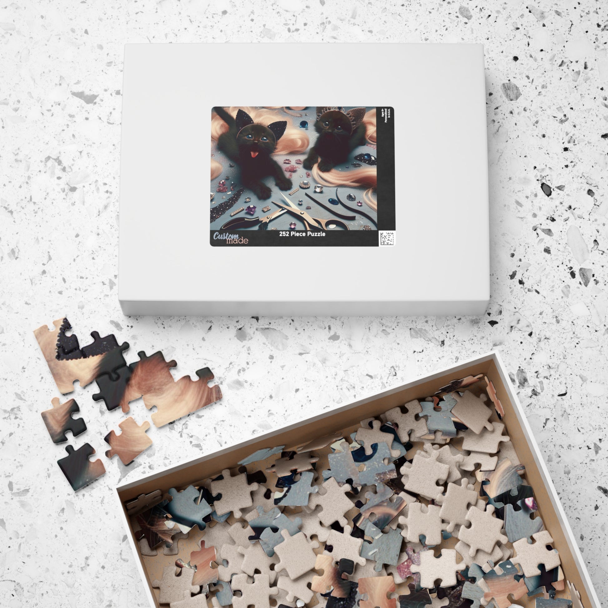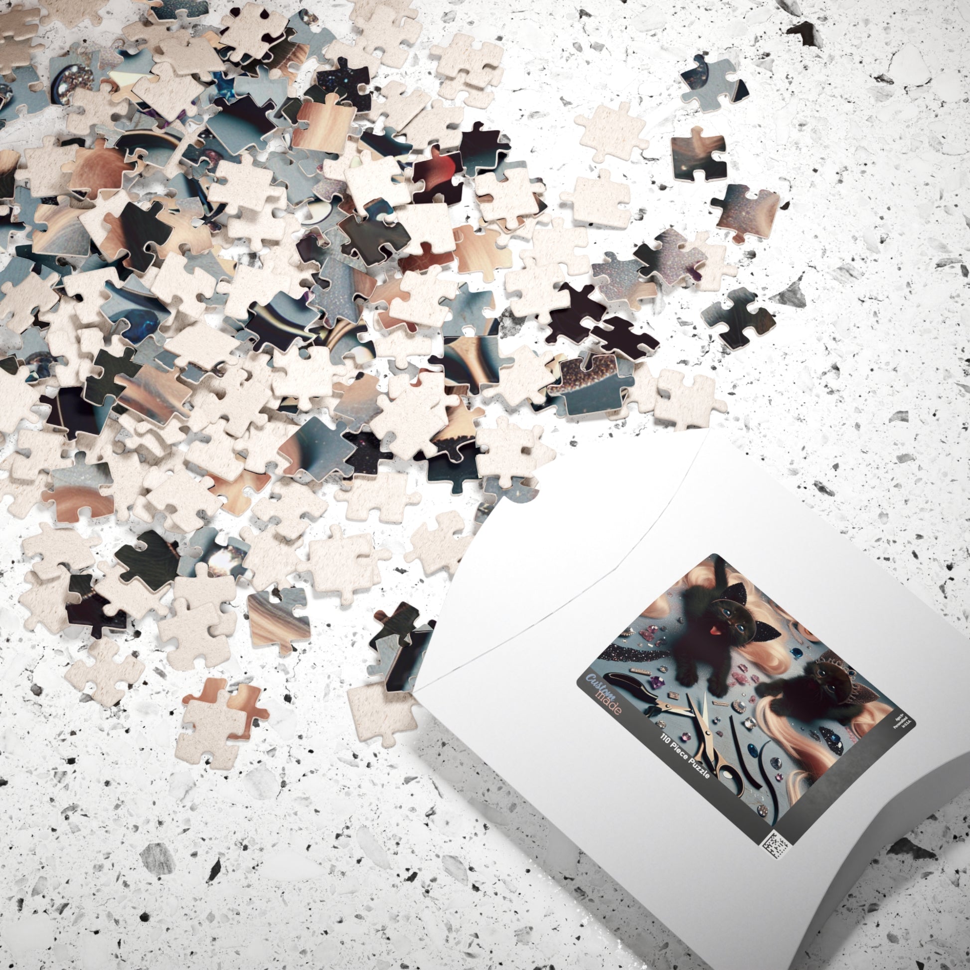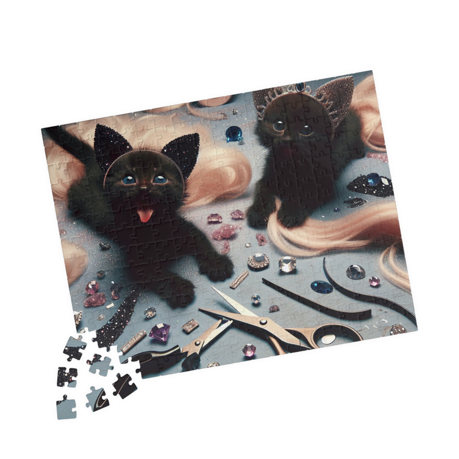 Soft-pawed kittens peep out from the scatter of materials—the quiet chaos of a maker’s corner made cuddly. This puzzle invites slow, cozy afternoons rearranging the pieces as if sorting supplies on a craft table. As you fit each chipboard piece into place, the scene becomes a small celebration of hands-on creativity and feline curiosity. The glossy finish lifts the colors and the kittens’ whiskers catch the light. It’s a meditative, joyful project to leave on a coffee table, bring to a crafty gathering, or return to whenever you need a gentle, tactile breather.