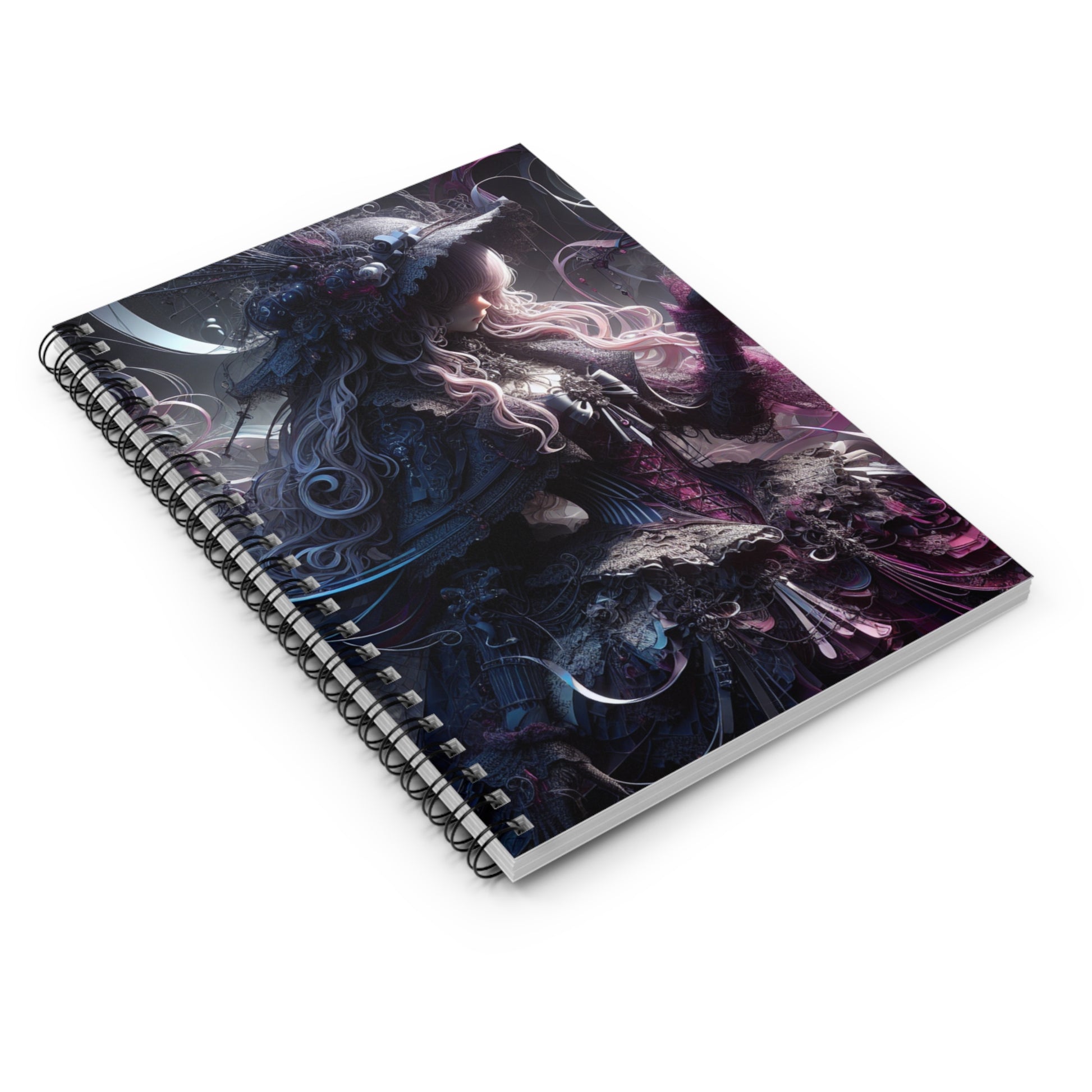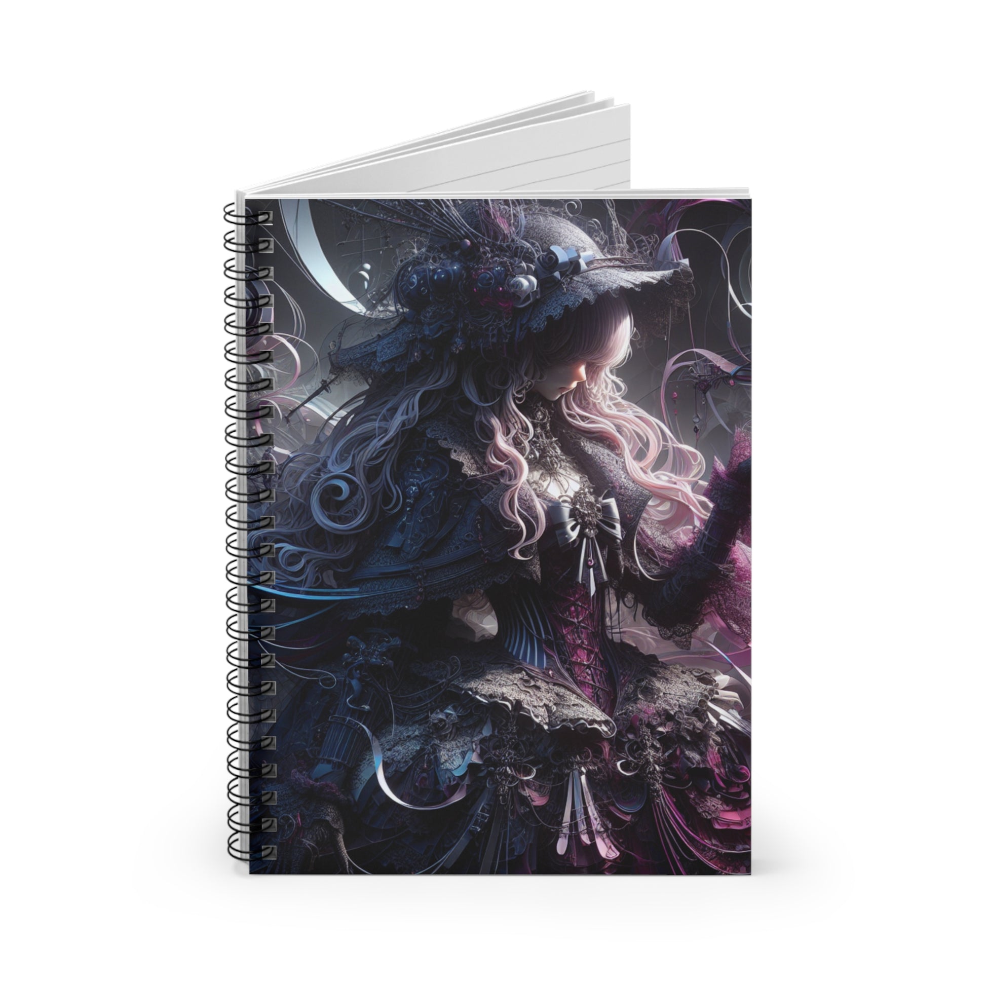 ♥This 6" x 8" spiral notebook brings a moody, gothic-fantasy visual to everyday notes. The front cover features a richly detailed, ethereal figure in layered textures and twilight tones — an image that invites slow, thoughtful writing. Inside, 118 ruled pages on smooth 90gsm paper make writing comfortable, whether you’re sketching story ideas, logging research, or keeping a private journal. A metal spiral binding lays flat for easy page turning and neat note-taking; the inside back cover includes a document pocket to keep loose notes, receipts, or clippings safe. Sturdy 350gsm covers and a dark grey back finish give it a grounded feel while the front artwork adds a mysterious, artistic edge.♥