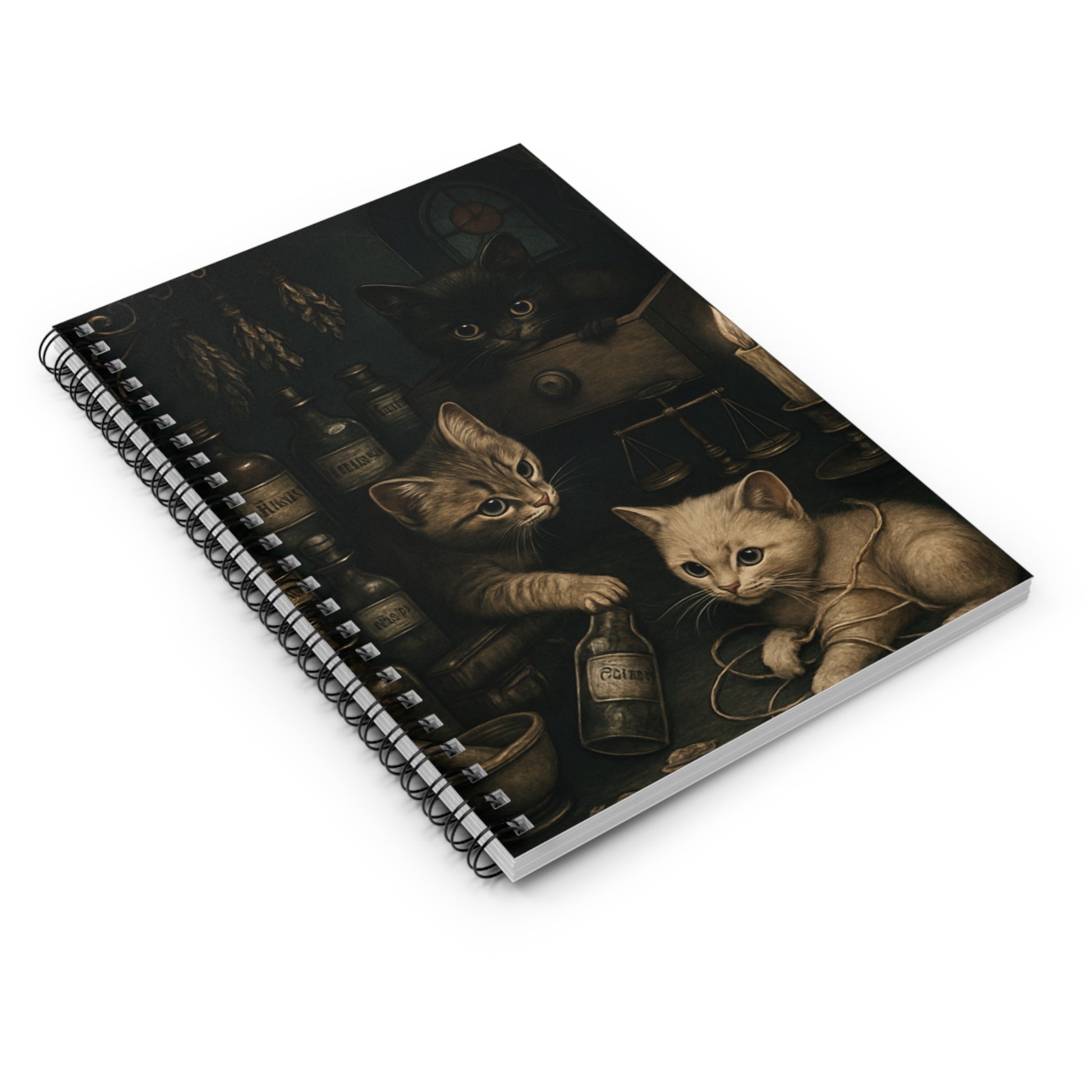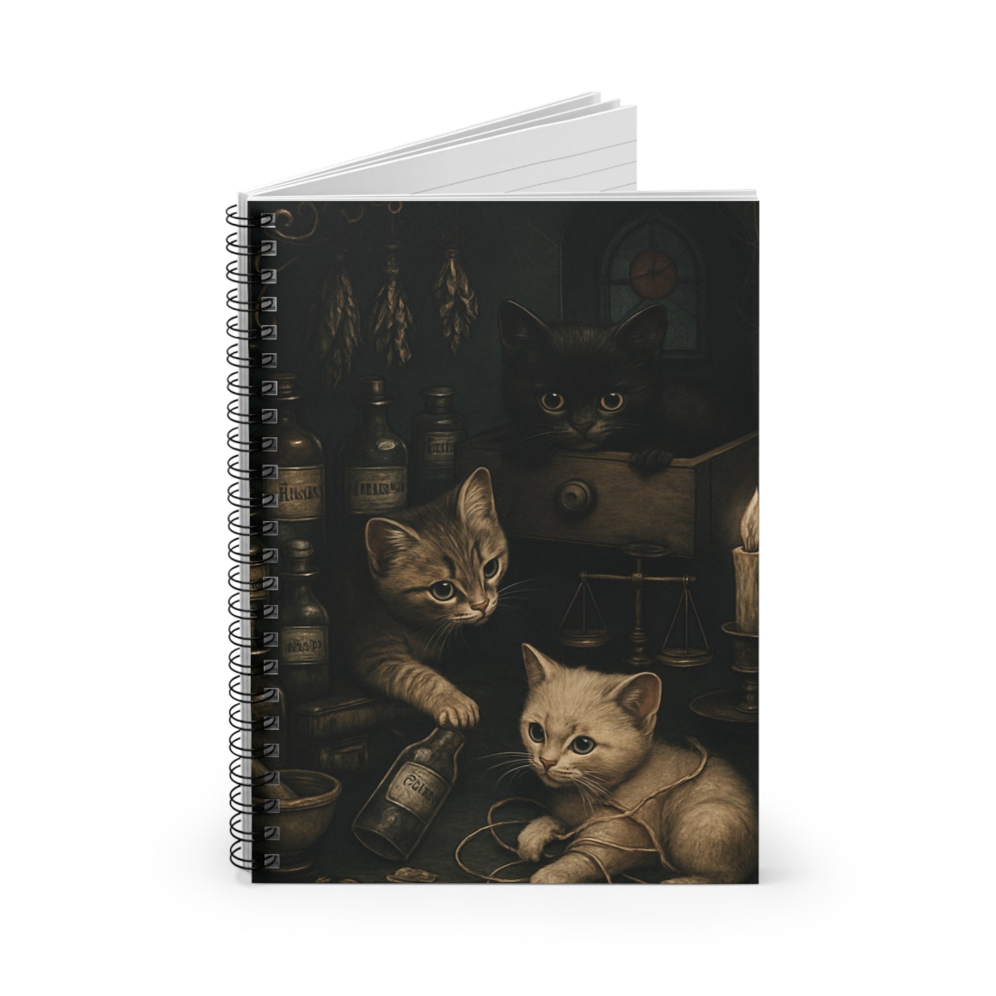 ♥A charming notebook featuring cute little kittens playing in an apothecary, perfect for any cat lover or stationery enthusiast. The design gives off a cozy and whimsical vibe, making it a great addition to your everyday life. Ideal for students, writers, or anyone who loves to jot down notes and thoughts. Perfect for back to school, National Cat Day, or as a thoughtful gift for a cat-loving friend.♥